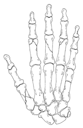 The hand skeleton is made up of many bones that form its supporting framework. This frame acts as a point of attachment for the muscles that make the wrist and fingers move. A fracture occurs when force is applied to a bone that is enough to break it. When this happens, there is pain, swelling, and decreased use of the injured part. Many people think that a fracture is different from a break, but they are the same (Figure 1). Fractures may be simple with the bone pieces aligned and stable. Other fractures are unstable and the bone tends to displace or shift. Comminuted fractures (shattered bone) usually occur from a high energy force and are often unstable. An open (compound) fracture occurs when a bone fragment breaks through the skin. There is some risk of infection with compound fractures.