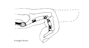Trigger finger/thumb happens when the tendon develops a nodule (knot) or swelling of its lining. When the tendon swells, it must squeeze through the opening of the tunnel (flexor sheath) which causes pain, popping, or a catching feeling in the finger or thumb (see Diagram 2). When the tendon catches, it produces inflammation and more swelling. This causes a vicious cycle of triggering, inflammation, and swelling. Sometimes the finger becomes stuck (locked) and is hard to straighten or bend.